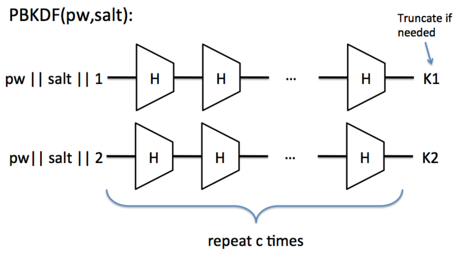 PBKDF 运算之后每次的结果都不相同c,增加暴力破解的计算量,从而增加破解时间salt 的选择如果做到 不可预测 ,则可以抵御预先计算 PBKDF 字典的加速暴力破解攻击方法
