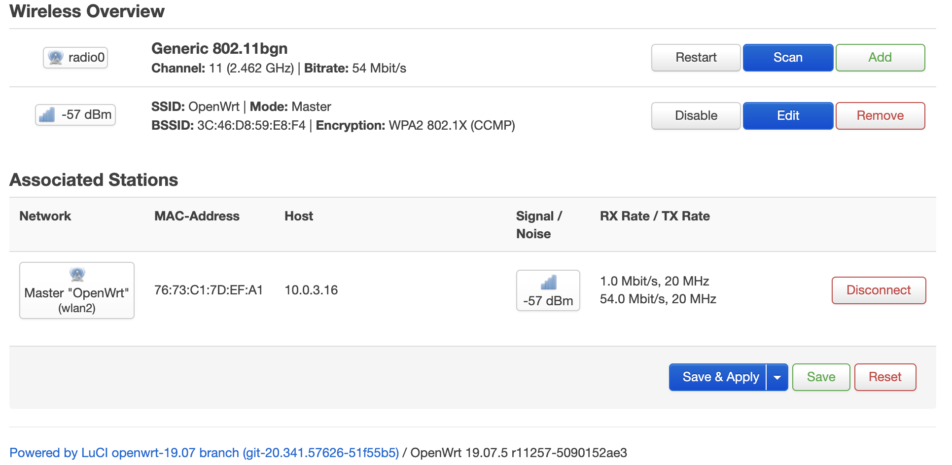 完成以上配置之后,可以通过 LuCI 重启无线网络以使配置生效。