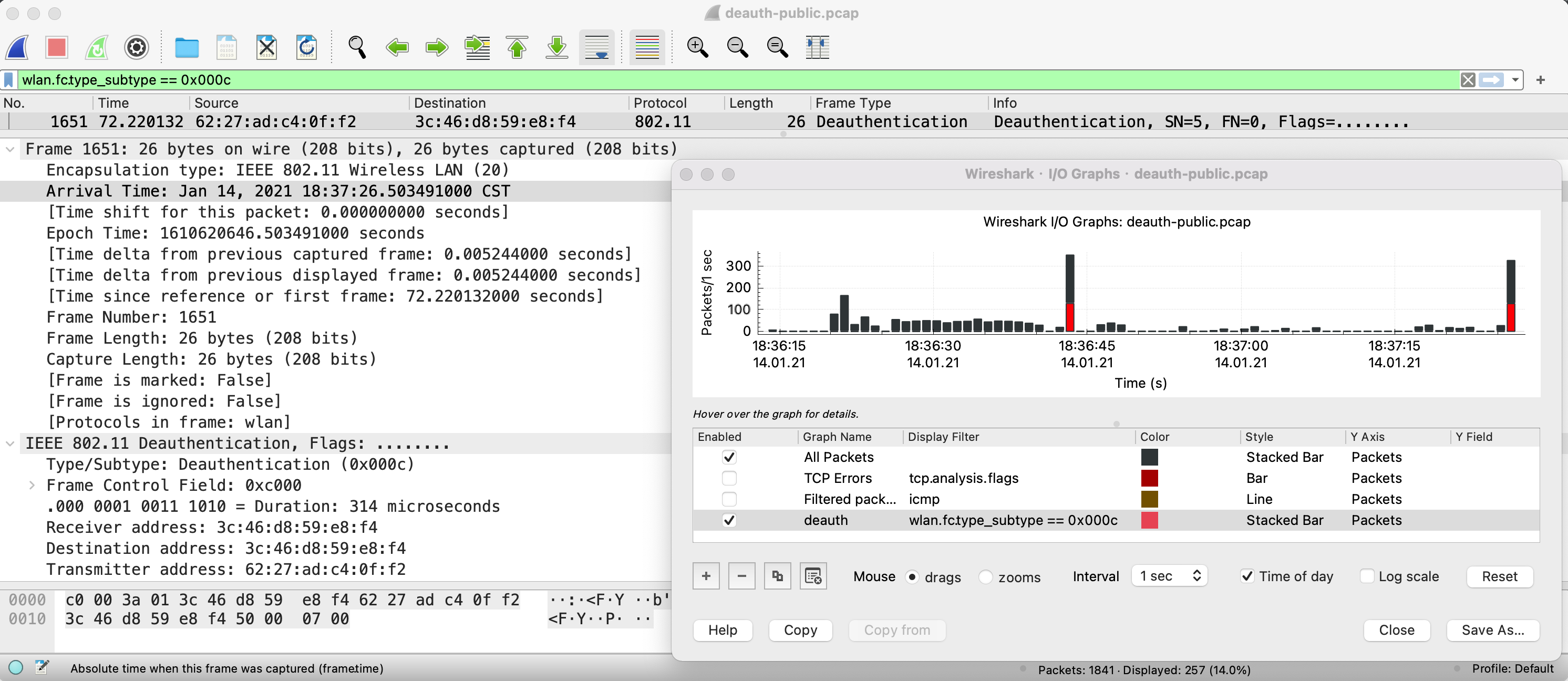 # 18:36:43 Sending 64 directed DeAuth (code 7). STMAC: [62:27:AD:C4:0F:F2] [44|39 ACKs]