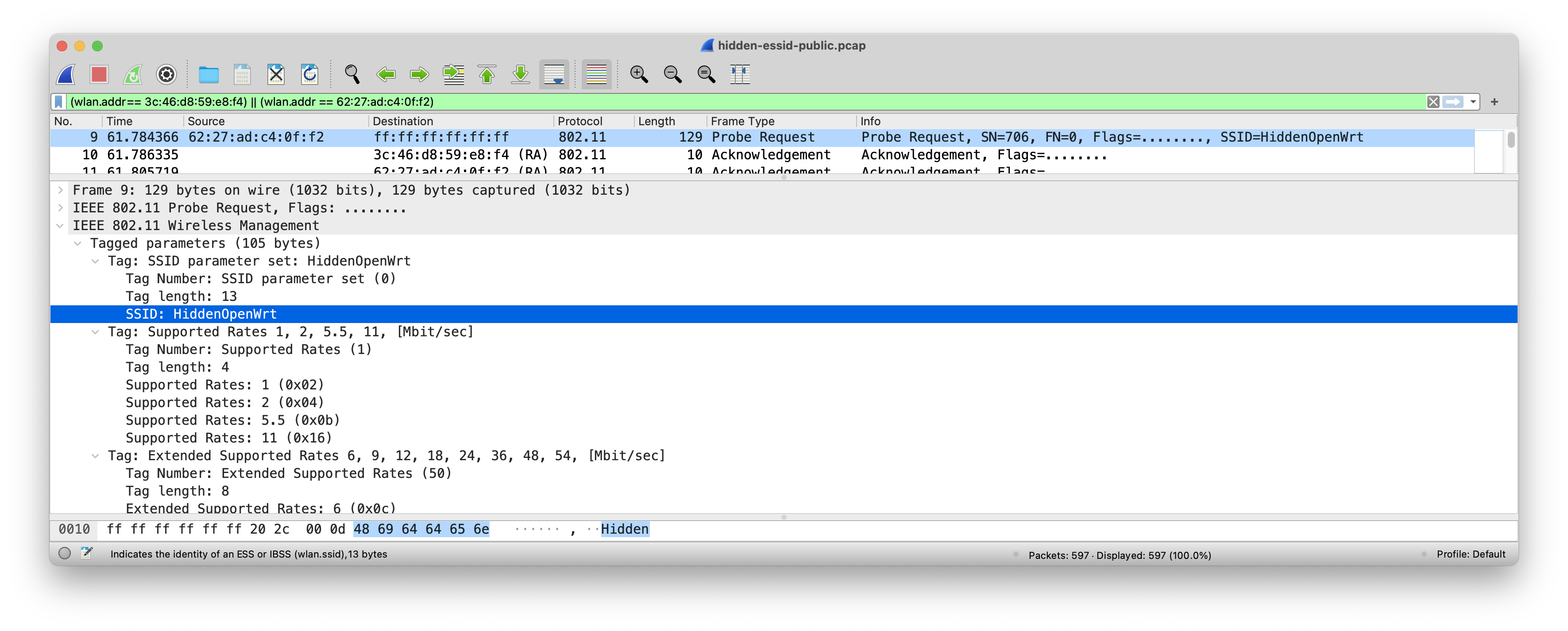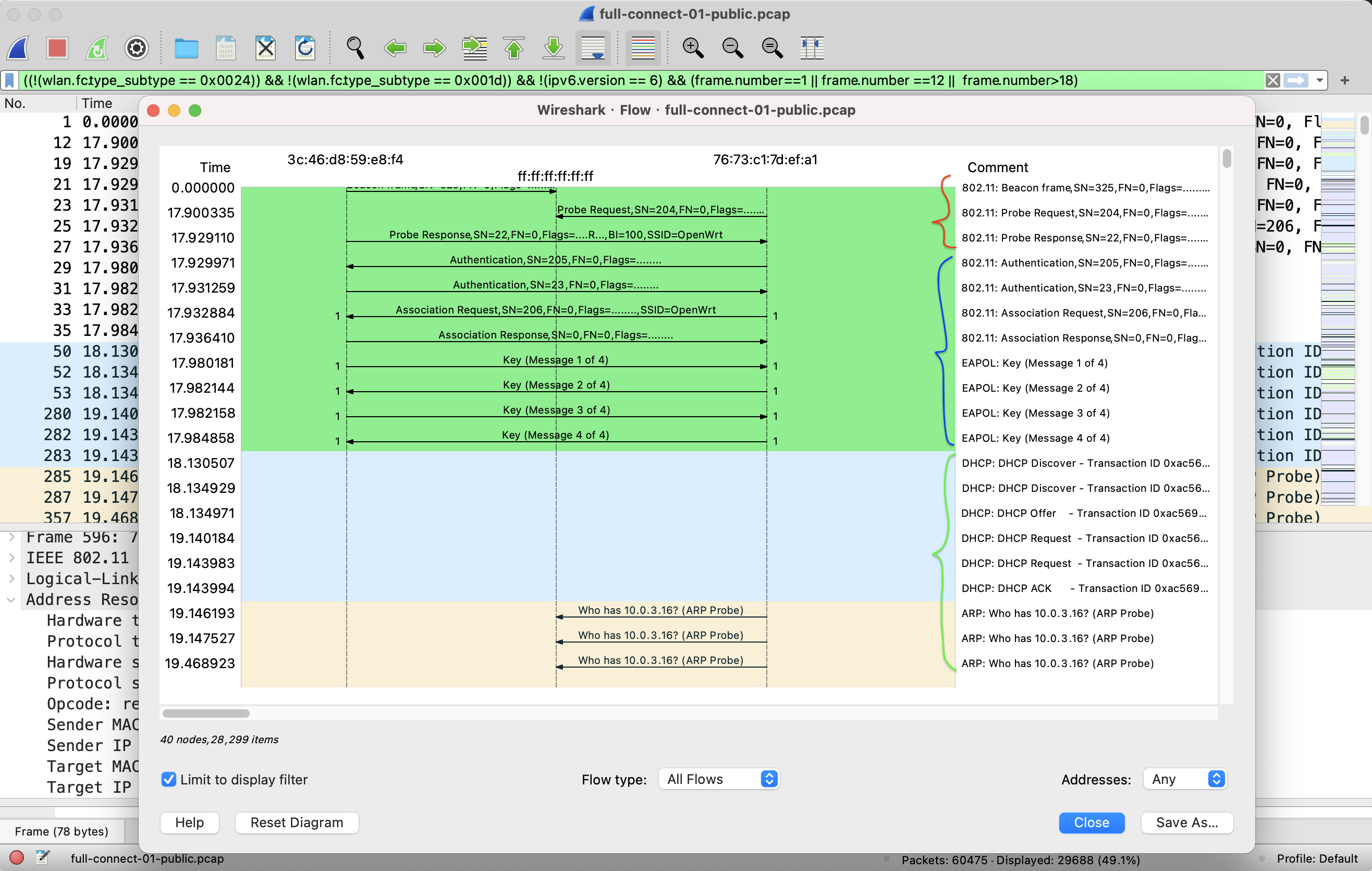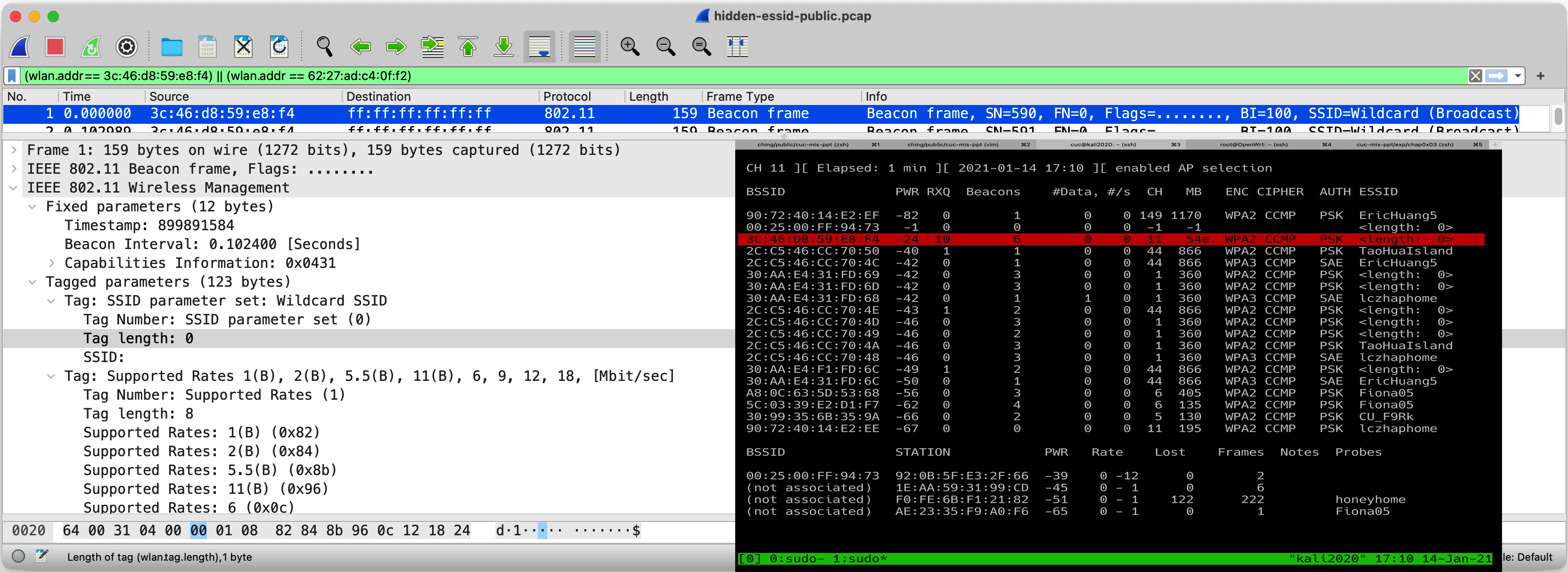 tshark -r full-connect-public.pcap -Y "wlan.fc.type_subtype==0x08 || wlan.fc.type_subtype==0x04 || wlan.fc.type_subtype==0x05 || wlan.fc.type_subtype==0" -T fields -e frame.number -e wlan.sa -e wlan.fixed.capabilities.privacy -e wlan.fc.type_subtype -e wlan.ssid | sort -u