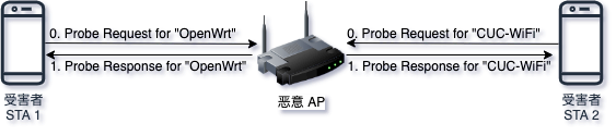 PNL 时,甚至可以同时保存 {ESSID, BSSID, Location} 。超出历史无线网络所在定位范围过大时,拒绝 自动加入 目标无线网络Probe Request 没有得到响应之后,就会认为目标无线网络当前不在附近,后续的 Probe Response 会在一段时间之内被自动忽略MANA Attack 会通过网络嗅探自动保存所有「看到」的 STA 网络连接请求和通信会话形成一个本地 PNL ,后续再收到 Probe Request 后会对本地 PNL 中存在的 STA 发送匹配的 Probe ResponseKARMA Attack 的防御措施也能用来防御 MANA AttackWindows 10 build 1703 之前版本 默认启用的 Wi-Fi Sense 功能会自动连入系统内置的所谓「高质量热点名单中热点」KARMA AttackKARMA Attack 的防御措施也能用来防御 Lure10 AttackBeacon Frame 广播Beacon Frame 有 SSID 包含在自己的 PNL ,则会自动发起连接KARMA AttackKARMA Attack 的防御措施也能用来防御 Known Beacon AttackEvil Twin 实验指南详见课本OpenWrt 也可以用于 Evil Twin 实验恢复/破解认证凭据