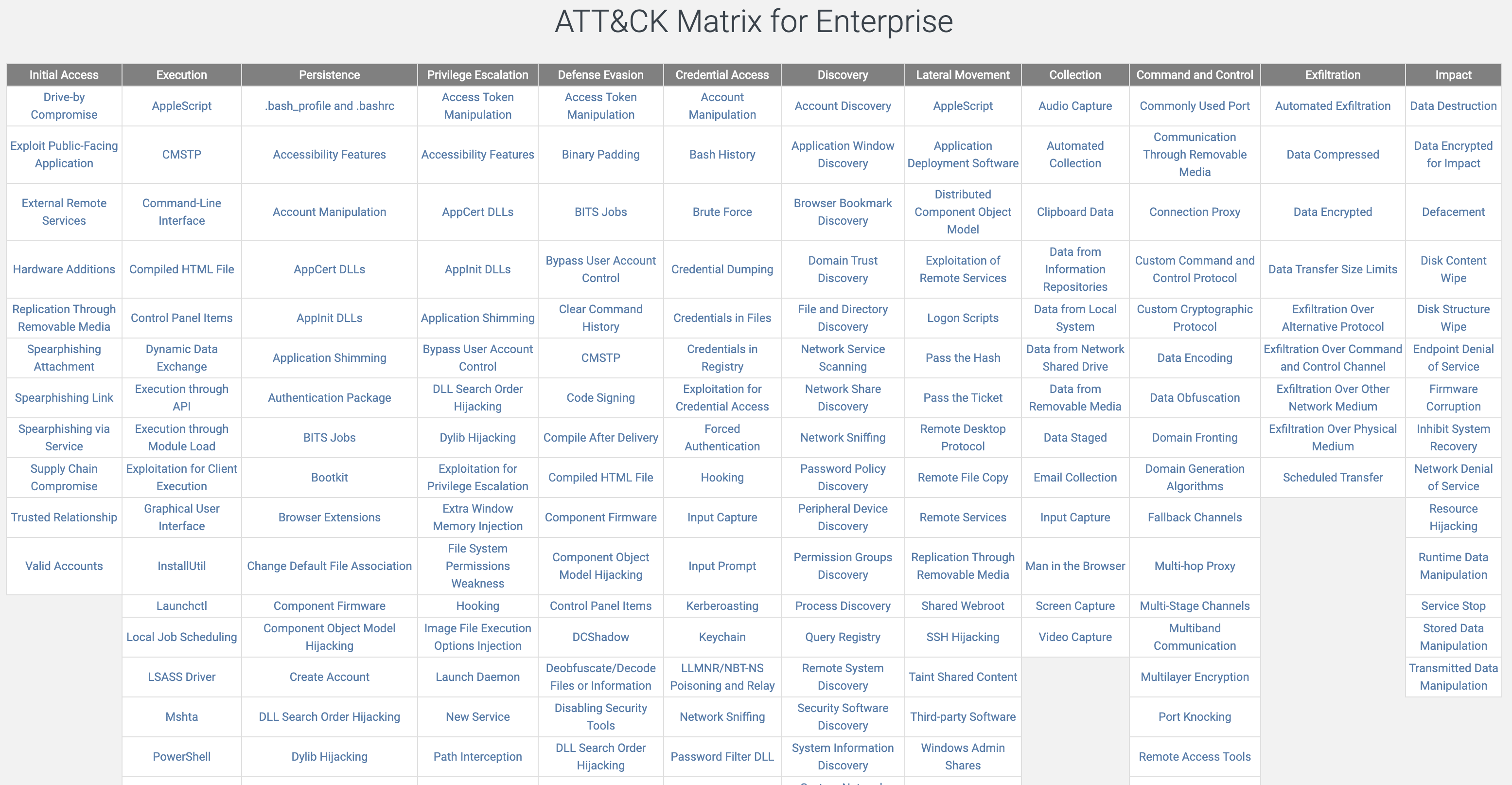 覆盖杀伤链模型的后五个阶段,ATT&CK for Enterprise 由适用于 Windows 、Linux 和 macOS 系统的技术和战术部分共同组成。