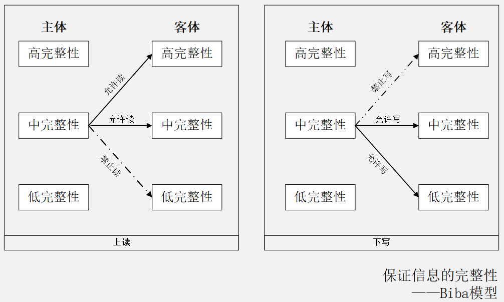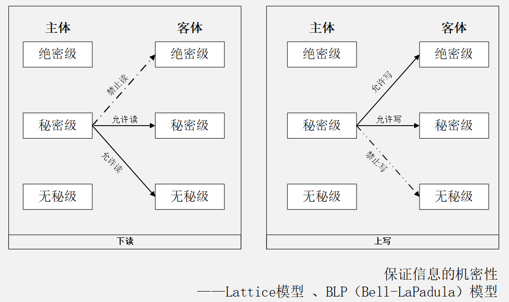 /etc/passwd 允许『所有用户』用户权限读取: 上读 行为被允许/etc/passwd 只允许『管理员』用户权限修改: 上写 行为被禁止强制访问控制 模型的⼀种实现形式